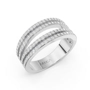 This design provides the impact of a cocktail ring with the comfort of a standard band. Its open-work structure reduces weight while maximizing diamond surface area, making it a functional, dazzling statement piece.