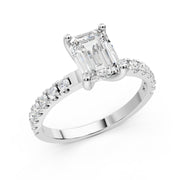 This ring pairs the transparent clarity of a step-cut emerald diamond with a shimmering pavé band to symbolize a love that is as honest and open as it is brilliantly enduring.