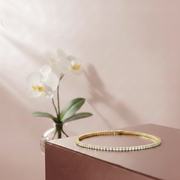 A sleek gold band gracefully lined with shimmering diamonds, blending modern minimalism with timeless elegance. Perfect for stacking or wearing solo for a refined everyday look.