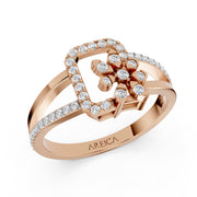 A captivating blend of modern architecture and natural beauty, this 18K rose gold ring features a diamond-encrusted geometric open frame intertwined with a delicate, sparkling floral cluster.