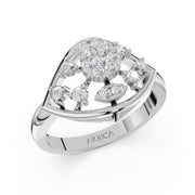 A shimmering bypass-style ring with a starburst diamond cluster and a sweeping pavé-accented shank.