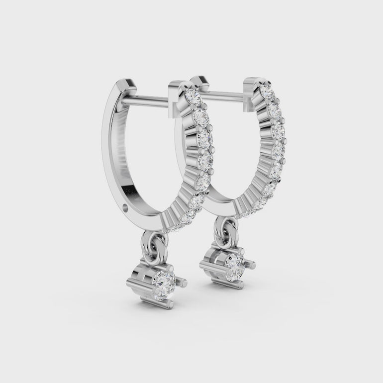 Add a touch of playful elegance to your collection with these exquisite diamond dangle hoops. the classic hoop silhouette is elevated by a shimmering line of pave diamonds along the front. Suspended from the base is a petite solitaire charm that dances and catches the light with every turn of your head. Perfectly sized for everyday wear yet sophisticated enough for evening events, these earrings are the ultimate versatile accessory. They sit comfortably close to the earlobe, offering a secure fit with a luxurious finish.