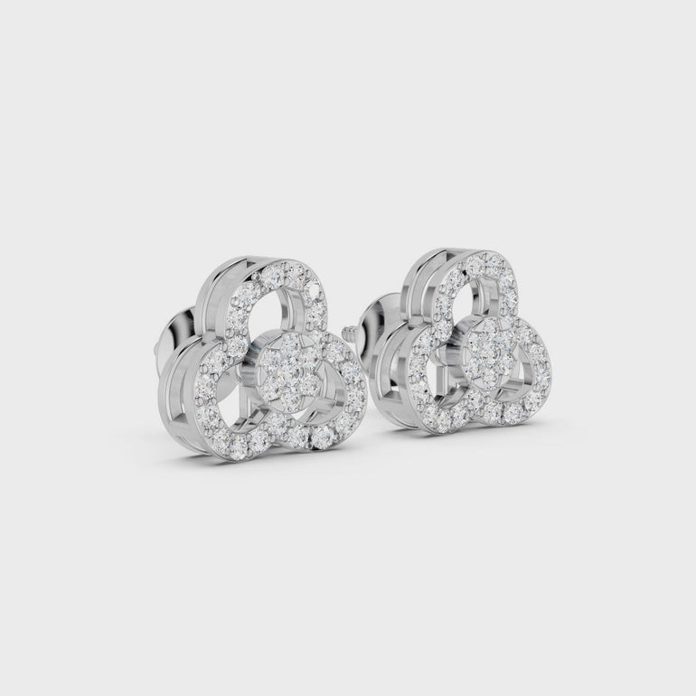 The Opulent Trinity Bloom Earrings feature a stunning three-halo design enhanced with a dazzling round diamond cluster, making them perfect for celebrations and elegant evenings.