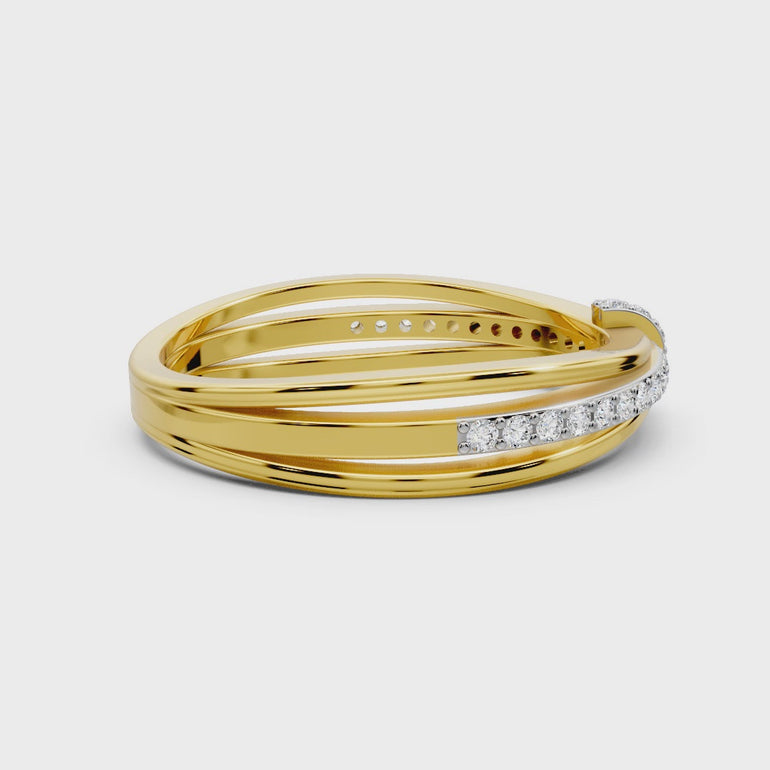 Celebrate the gift of love with this uniquely symbolic and beautifully structured diamond ring named after the brand itself as it is a gift of our lives. The foundation of the ring is built upon a strong, parallel structure of three gold lines, symbolizing the past, present, and future shared with your loved one. The middle line is paved entirely with dazzling, hand-set diamonds, representing the sparkle and brilliance that person brings to your life. A small, contrasting vertical line or bar wraps neatly around the bands at the top center, completing the design like the ribbon securing a precious gift that the person is to you.