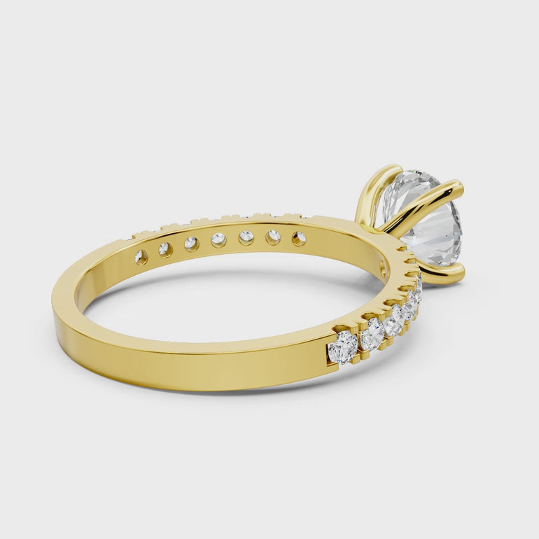 This exquisite engagement ring is designed for the bride who cherishes classic elegance with maximum sparkle. Unlike a plain solitaire, this ring features a pave setting along the shoulders. These smaller, precision-set diamonds act as a path of light, drawing the eye directly to the main stone while adding a delicate, glittering texture to the ring's profile. It captures the feeling of a quiet promise made under the sky, where the only thing more brilliant than the stars was the look in your partner's eyes. It represents the "yes" that changed the rhythm of your heart forever.