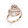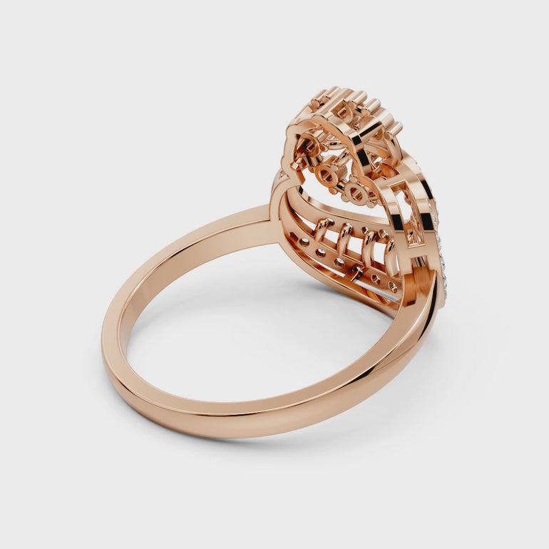 Discover the perfect balance of movement and tradition with the Floral Vortex Filigree Ring. Crafted in warm rose gold, the face of the ring presents a mesmerizing illusion of motion, with two concentric, swirling ribbons of pave-set diamonds wrapping around a central brilliant floral cluster. Unlike standard rings, the beauty of this piece extends to the profile. The gallery features a high "cathedral" setting adorned with elaborate, open-work filigree scrolls, ensuring the ring catches the light and the eye from every possible angle. It is an ideal choice for the woman who appreciates jewelry that is as detailed as it is dazzling.