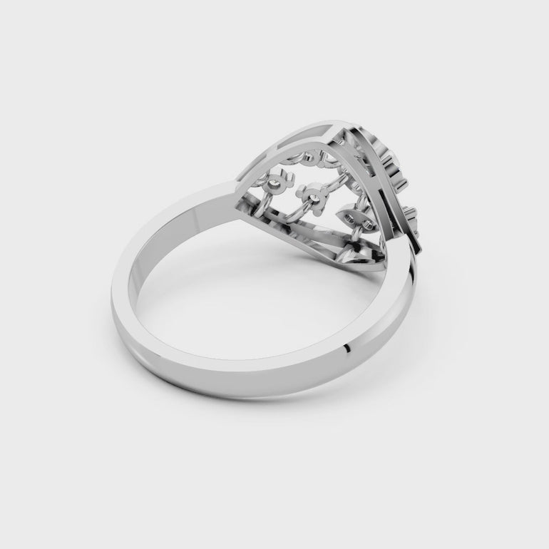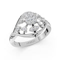 The Ethereal Bloom ring features petals of light. A central cluster of brilliant-cut diamonds serves as the heart of the piece, with smaller stones branching out like dew drops on a silver vine. The teardrop border provides a sense of balance and protection, making it a perfect symbol of personal growth and beauty.