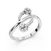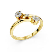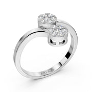 The Ayra Twin-Cluster Ring is a contemporary masterpiece featuring a polished bypass band that gracefully holds two radiant diamond floral clusters.