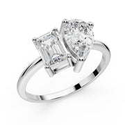 A modern interpretation of the romantic "You and Me" style, this ring features a striking geometric emerald-cut diamond nestled beside a brilliant pear-shaped diamond.